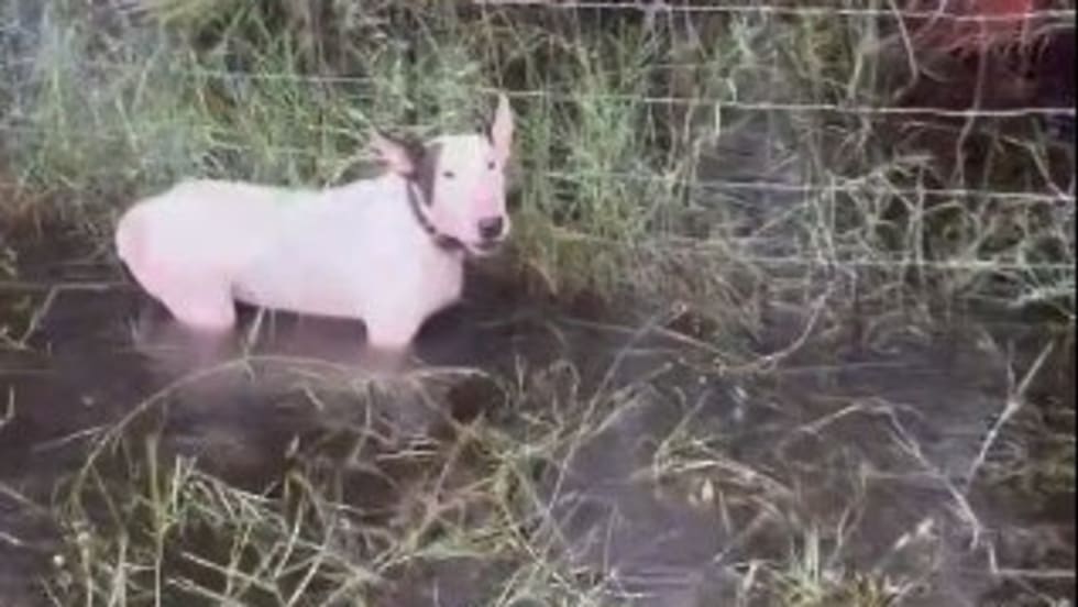 A trooper walked toward the dog, who was tied to a fence and standing in a deep puddle that reached the animal’s stomach. The dog growled but the trooper managed to untie him and took him to safety.