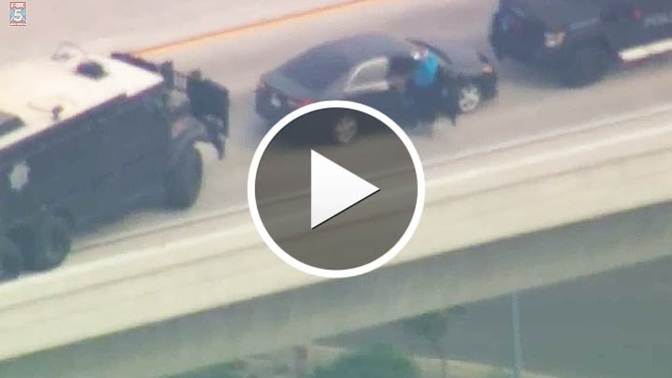 The situation wrapped up peacefully at about 9:45 a.m. when Daniel Perez, 43, emerged from a black sedan carrying a child and a cellphone on a transition road between the 52 and 67 freeways in San Diego County.