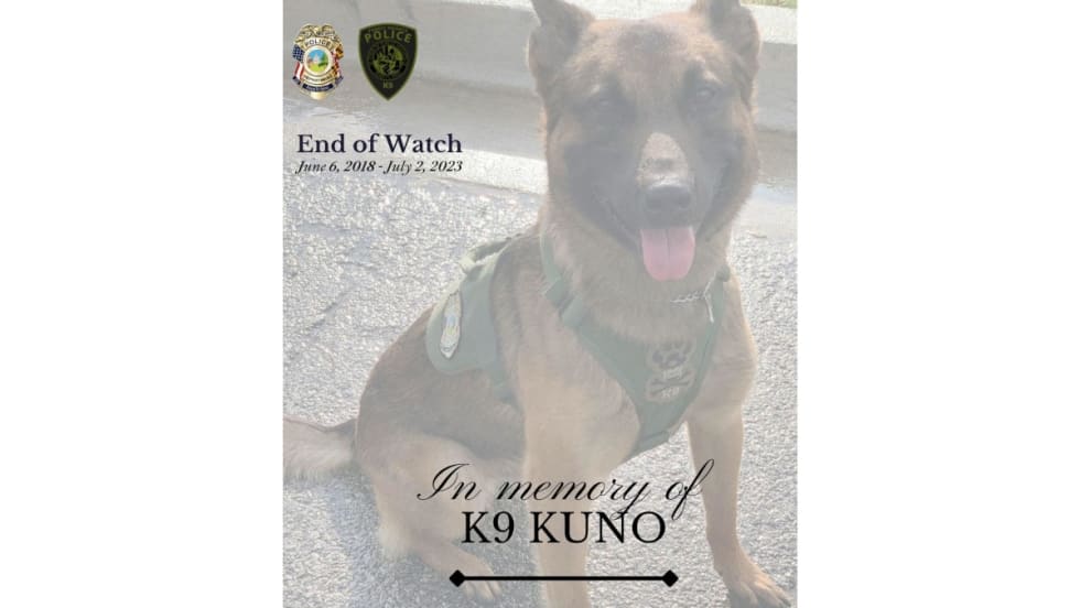 K-9 Kuno was conducting a search of a school building looking for a burglar when he showed signs of heat stroke. Kuno’s handler reportedly took him back to his vehicle and tried to hydrate him, but Kuno collapsed.