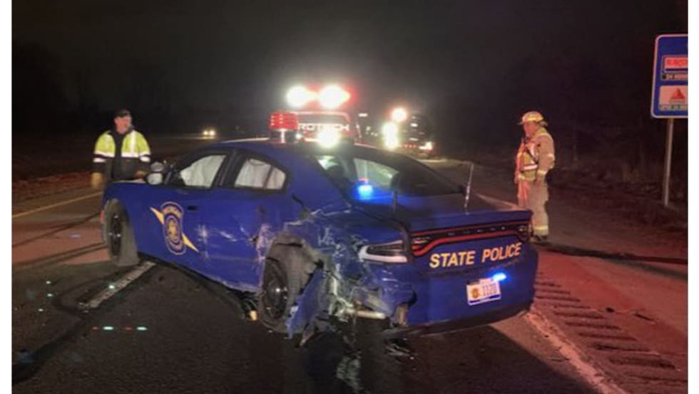 The MSP car was parked with its emergency lights on while investigating a car-deer crash at 1:12 a.m., March 17 on I-96 in Eaton County, when the Tesla hit it, police said