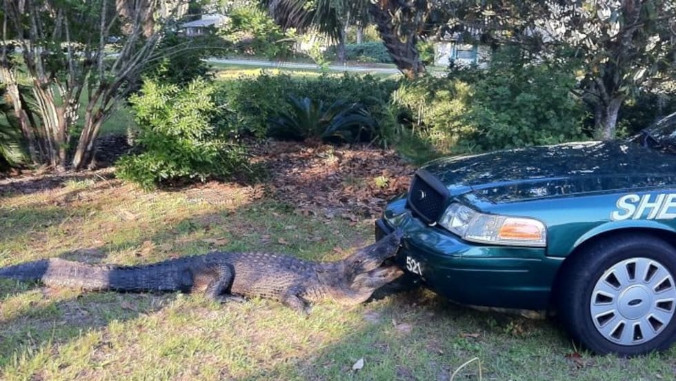 A 10-foot alligator ran afoul with the law in Florida, after attaching its jaws to the front bumper of an Alachua County Sheriff's deputy's Crown Victoria. After the gator affixed its jaws to the front bumper, the deputy reversed the vehicle to loosen the animal's grip.