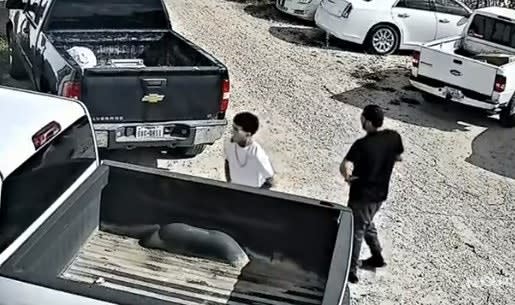 Houston police are searching for the man in the black shirt in this photo. Police say he spoke with accused cop killer Robert Soliz (reportedly in white shirt) immediately after the shooting. (Photo: YouTube screen shot)