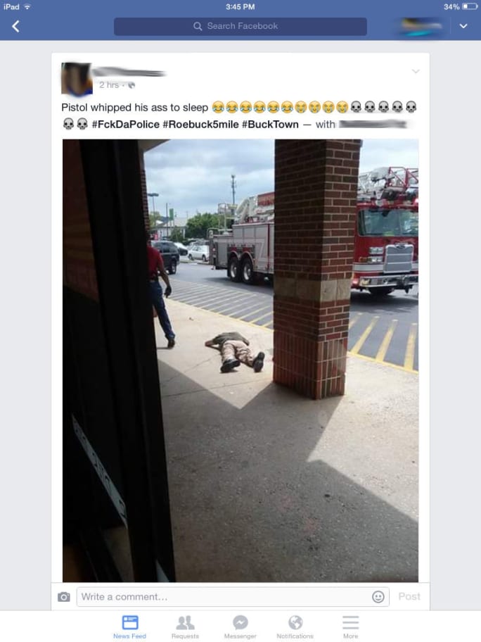 Not long after the attack, photos began to surface on social media showing the detective lying face down on the pavement. Another photo showed him bloody and kneeling, but awake. In some cases on Facebook, the photos were accompanied by words of support for whoever beat the detective.