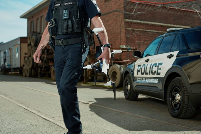 Officer carrying Responder drone. The arms fold in for compact carry.
