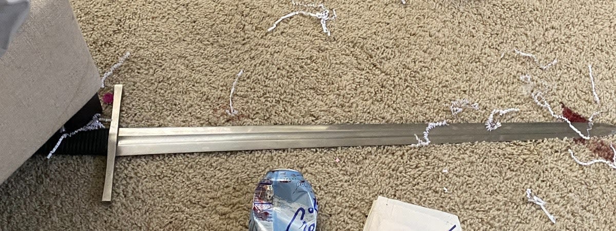 The sword used by a man to hold his family hostage is shown after SWAT officers rescued the hostages.