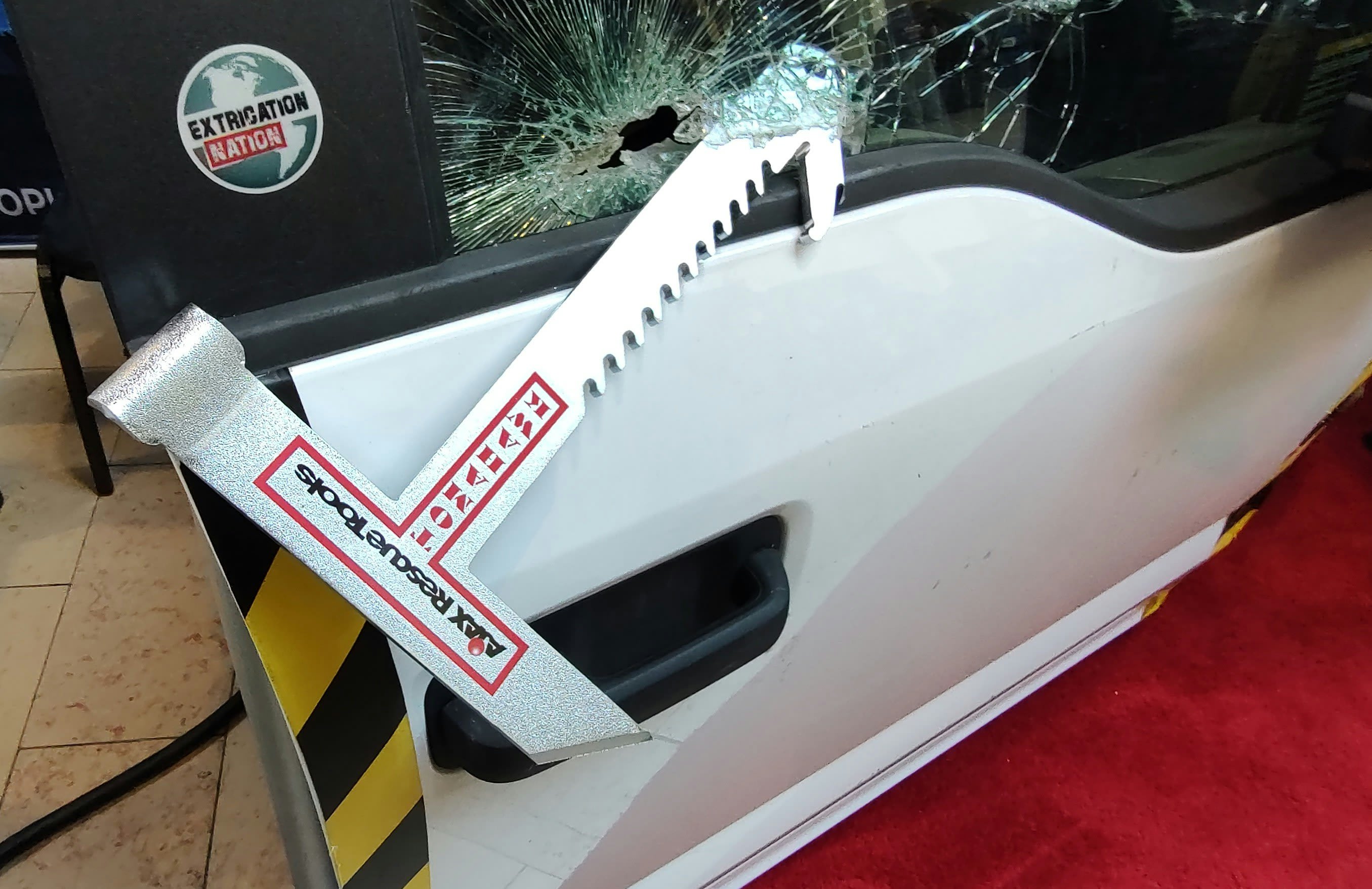 exhibited what it sees as a solution, the Extrication Tomahawk. Taking many features from tasks commonly associated with firefighters, the tool features 10 tools in one to help an officer break and clear glass. Several of the key features are a pry bar, a hardened point for breaking glass or puncturing a tire, and a laminated glass saw.