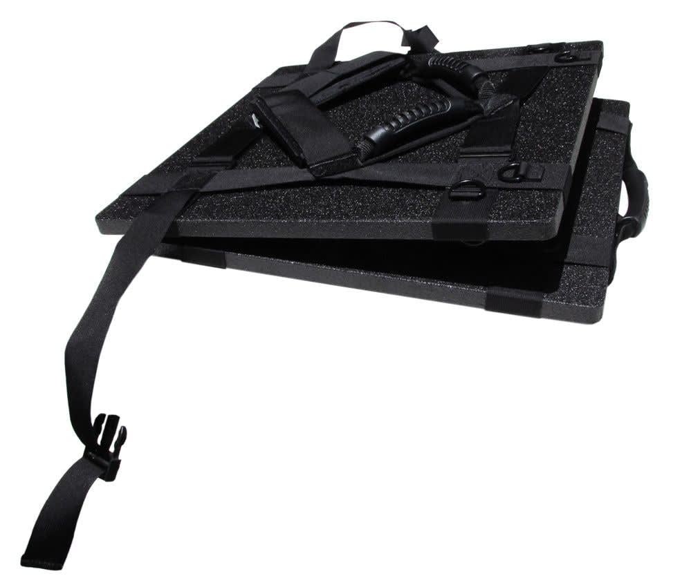 Designed to meet or exceed N.I.J. threat level III (rifle) or IIIA (handgun), the Spartan Shield defeats high-powered rifle rounds and gives you a protection area 19 inches wide by 34 inches tall when deployed. It easily fits behind a seat or in a niche in a truck when folded, measuring only 19 by 19 inches. Its lightweight form allows lightning fast deployment at only 16.3 pounds.