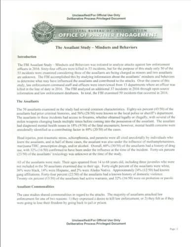 "Law enforcement officials believe that defiance and hostility displayed by assailants toward law enforcement appears to be the new norm," said the leaked internal report stamped "For Official Use Only" and acquired by the