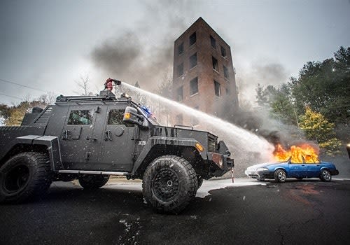The Lenco BearCat X3 'FireCat' is a rapid response armored vehicle with self-contained water deployment capability. The fully protected, onboard water tank and roof-mounted nozzle can address civil disturbance scenarios and small structure or car fires before they turn into large scale property damage. The vehicle can also hook direct to a main water line or pumper truck for continuous water flow. The X3 FireCat comes standard with Lenco's proven .50 CAL armor protection, rotating roof hatch and tactical breaching tools, including the RAM Bar, Gas Injector and 4-Way RAM Camera.