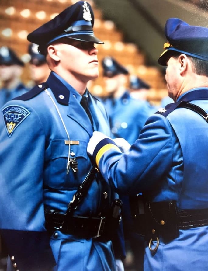 "Massachusetts State Police Trooper Matthew F. Daigle passed away suddenly yesterday. Today, we continue to mourn the loss of a member of the Massachusetts State Police family, and to pray for Trooper Daigle and his loved ones. Trooper Daigle is seen here being pinned with his badge at his graduation from the State Police 80th Recruit Training Troop in October 2011, and in a photo during his service in the United States Air Force."