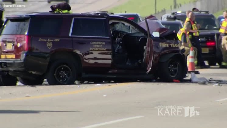 The state patrol originally tweeted the trooper was "pinned" and had to be "extricated" from his vehicle. (Photo: KARE screenshot)