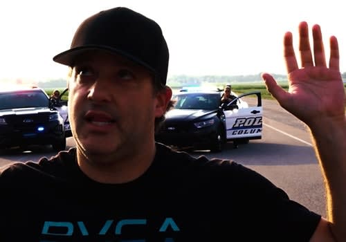In the opening segment of the video, officers pretend to pursue at high speed and then pull over Stewart on a desolate rural road.