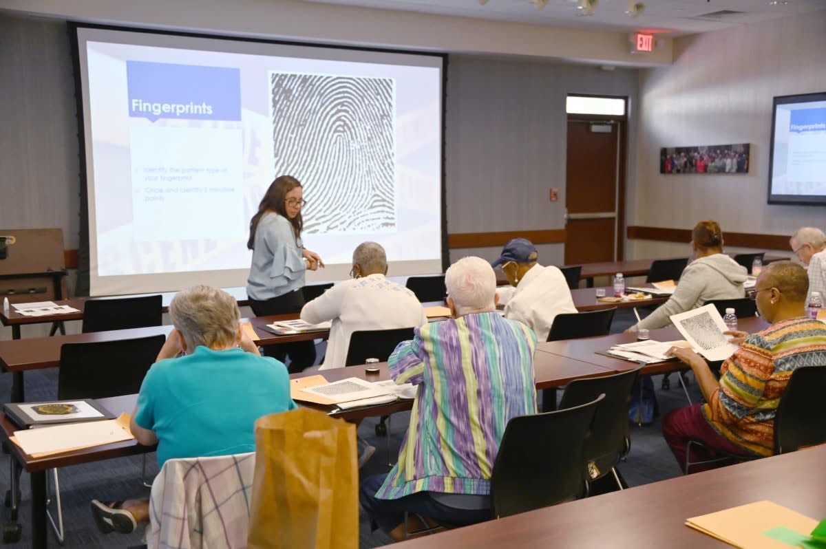 Senior Citizen Police Academy participants learn through a hands-on exercise with the Crime Scene Investigations Unit.