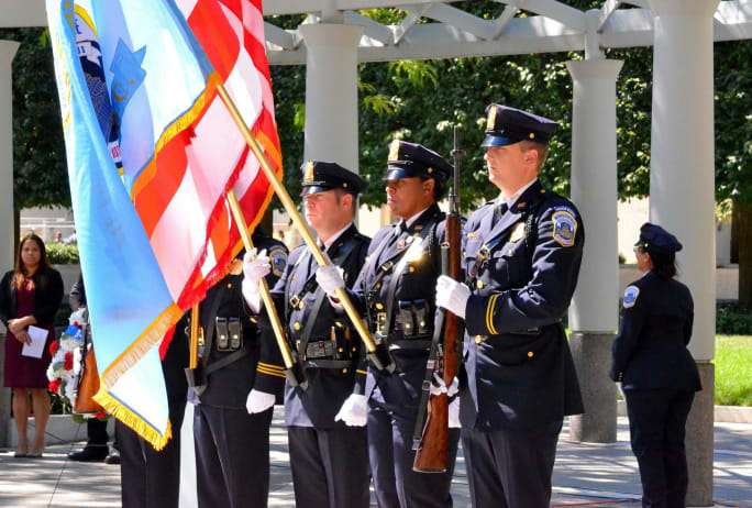 Memorial Fund Chief of Staff Herbert Giobbi officiated the ceremony. Federal Law Enforcement Officers Foundation President and NLEOMF Vice Chairman Jon Adler delivered the keynote remarks, and heralded the honor and patriotism of those who made the ultimate sacrifice. Following those remarks, the fallen officers' names were read aloud, and NLEOMF Board Officers Jon Adler and Ken Hartwick placed a special 9/11 Memorial wreath at the section of the Memorial Wall where all the 9/11 heroes' names are inscribed. The names of the 72 officers are engraved together on the Memorial's west wall on Line 23 of Panels 9 through 22. Also, the names of 13 officers who died from subsequent illnesses related to rescue and recovery work at Ground Zero and other sites were included in the reading of names.