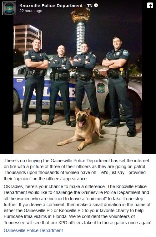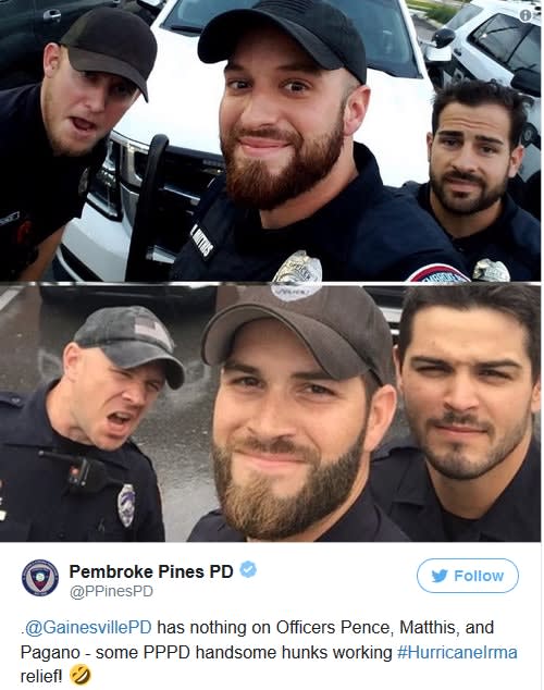 A selfie posted to the Facebook page of the Gainesville Police Department in Florida Sunday went viral after attracting flirtatious comments, reports ABC News . The agency followed up with a post promising to create and sell a calendar of its attractive officers "and funds raised will go to Hurricane Irma recovery here in Florida."
