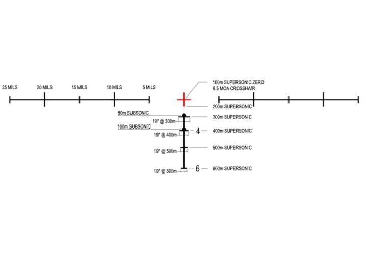 Utilizing standard 16-inch barrel velocities, the 300 AAC Blackout reticle is designed to be calibrated with supersonic (115 grain) ammunition. Users zero the scope at 100 meters using the center of the crosshair. The bottom tip of the crosshair serves as the 200-meter supersonic aiming point.