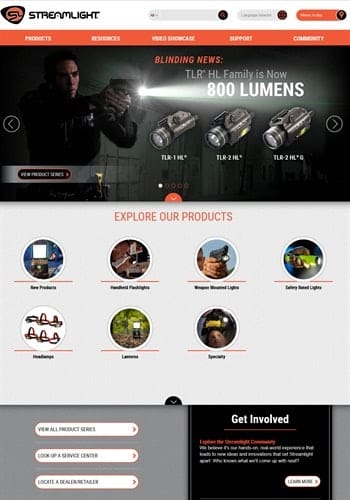 The updated website's main menu now includes sections on products, resources, video showcase, and support. A new feature is the site's Community section, providing drop down menus for corporate information; press releases and other media; trade shows and events; and a portal for purchasing Streamlight-branded gear. Easy-to-navigate tabs allow users to search, choose a language, and find a dealer to purchase products.