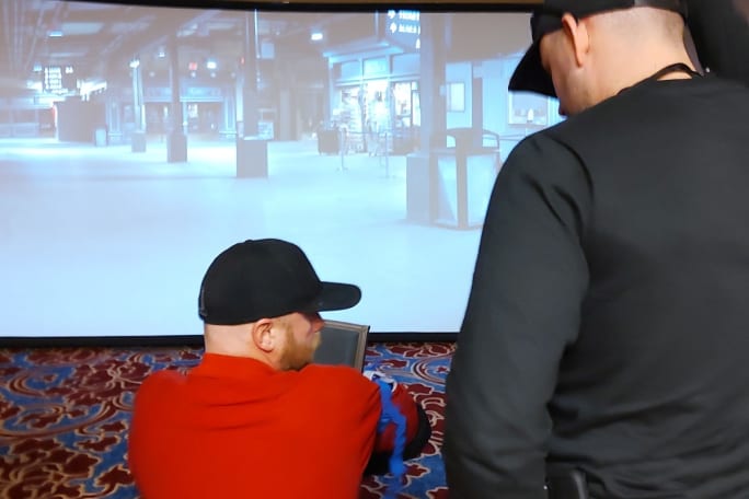 Trainers participate in a scenario that requires them first to apply a tourniquet, then stay in the fight and engage a threat during a VirTra simulation led by Lon Bartel.