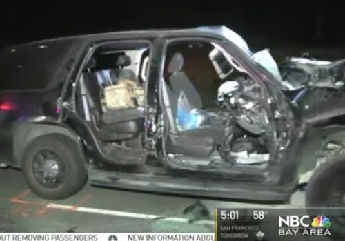 The officer became trapped inside his vehicle, which caught fire after the crash, reports KNTV . Two CHP officers from Dublin were nearby, one of whom used a fire extinguisher to put out the flames, according to Reed.