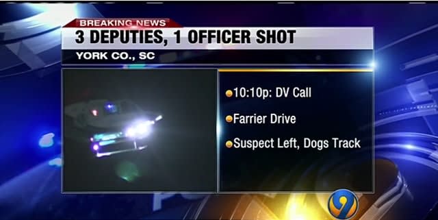 Four York County, SC, law enforcement officers were shot early Tuesday morning while searching for a domestic violence suspect in a wooded area. The suspect was also shot and is in custody.