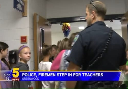 Police officers and firefighters in Greenwood, AR, lent a helping hand to the school district on Wednesday. They served as substitute teachers at the middle school so staff members could attend the funeral of a fellow teacher who died suddenly last weekend.