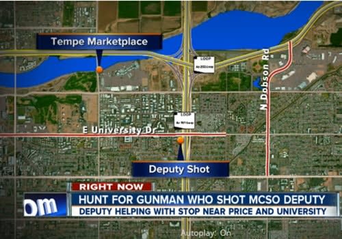 According to the Tempe Police Department, a deputy with the MCSO DUI task force was completing a traffic stop with a man in a car at Price Road and University around 2 a.m. when another vehicle, not connected to the stop, drove up behind the deputy and opened fire.