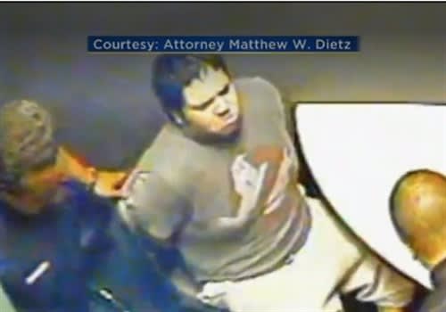 Surveillance video shows an officer trying to question Soto about the incident, but it's clear that he is unable to communicate. At one point, Soto indicates that he wants to have his shackles removed. But the request is denied.