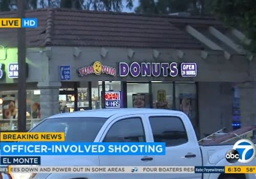 The officer-involved shooting happened just before 1 a.m. Investigators at the scene said it started when the unidentified suspect tapped at the 24-hour Yum Yum Donuts window with a knife, demanding coffee and pastries. The suspect eventually walked off.