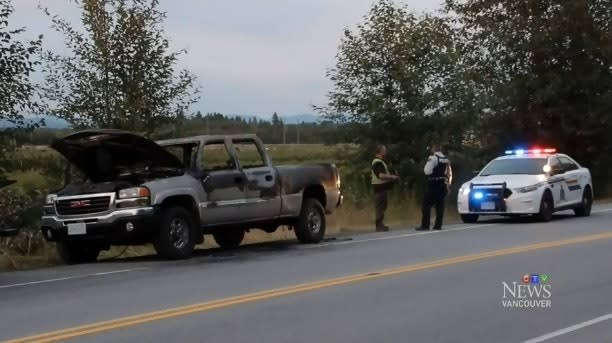 The man was gone when officers arrived at the scene of the still-burning truck, but they recognized the vehicle as one that was stolen from the Maple Ridge area last week, and that had eluded police earlier in the day. Police had been looking for the pickup, which they say may be connected to a series of break-and-enter cases where firearms had been stolen.