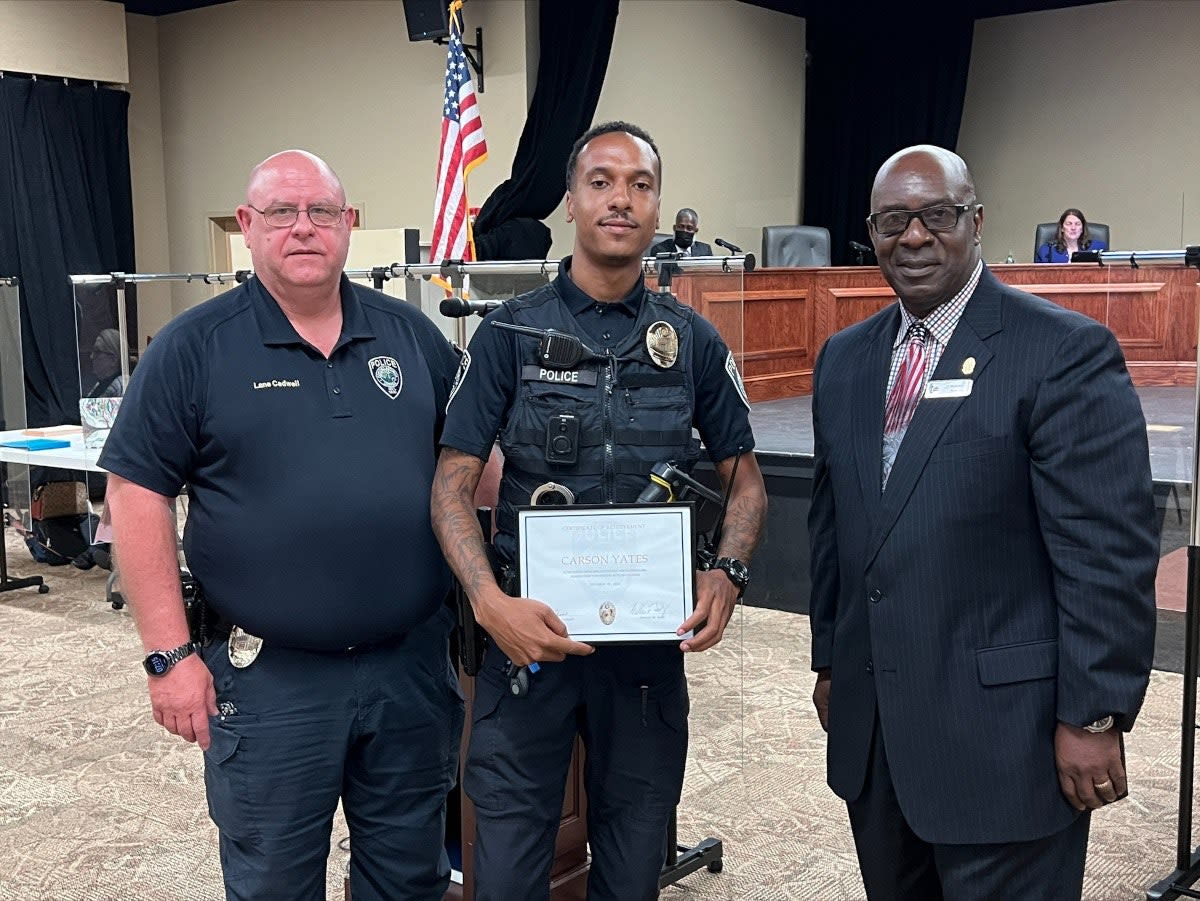 Officer Carson Yates was recognized at the Powder Springs Council Meeting for his actions involving CPR on the Silver Comet Trail, a popular paved trail winding through wooded areas of Cobb County.