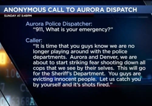 FOX31 Denver obtained the audio of the call: "It's time that you guys know we are no longer playing around with the police departments. Aurora and Denver, we are about to start striking fear shooting down all cops that we see by their selves. This will go for the sheriff's department. You guys are evicting innocent people. Let us catch you by yourself and it's shots fired."
