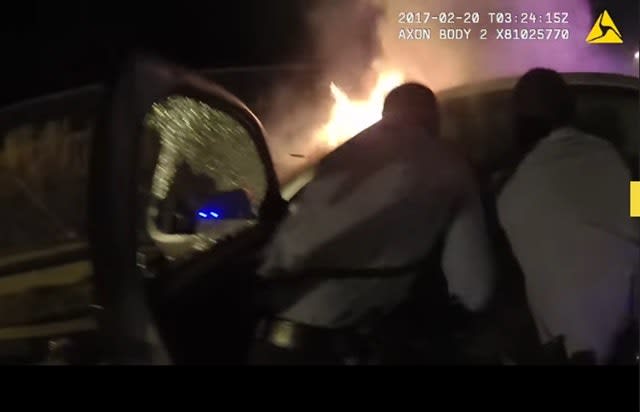 “I guess I’ve seen too many movies, because I’m thinking the car’s going to blow up the whole time,” Officer Steven Hines said Tuesday as he and three other officers spoke about the rescue. The footage released is from his body-worn camera.