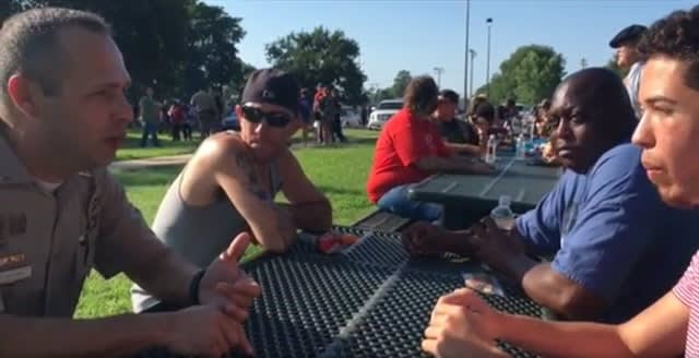 At one table, three men - a black man, a Hispanic man and a white man - sat down with burgers next to Lt. Travis Rakestraw to share their ideas.