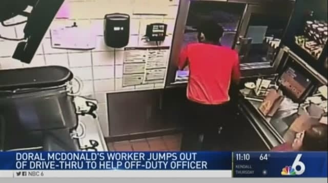 A South Florida McDonald's worker jumped out of the restaurant's drive-through Tuesday to render aid to an off-duty Miami-Dade Police officer who was in medical distress.