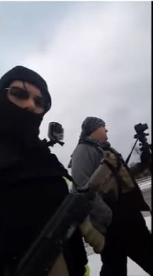 One of the men wore a black mask and bullet-resistant vest and a had a semi-automatic rifle slung over his shoulder, according to police.