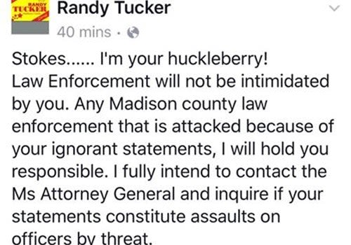 Stokes' comments were met with a strong response by Madison County Sheriff Randy Tucker who took to Facebook to say, "Stokes…I'm your huckleberry. Law enforcement will not be intimidated by you." The saying "I'm your huckleberry" was common in the 19th century and was revived in the 1993 movie "Tombstone." It can mean "I accept your challenge."