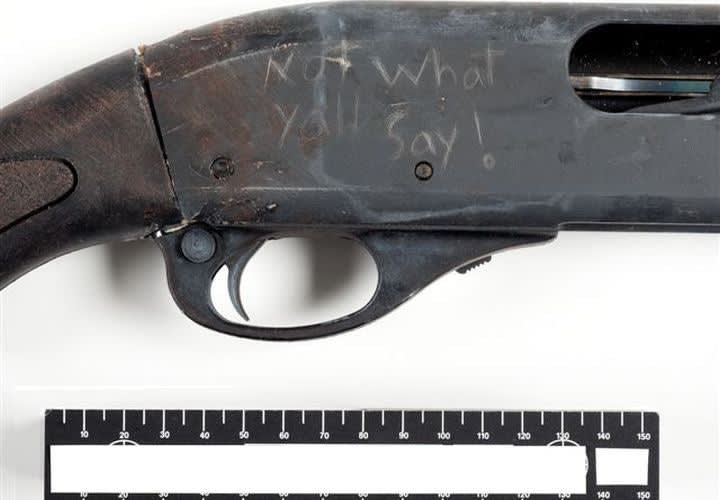 "Purple duct tape covered the end of the stock and handwritten etchings were present on various parts of the shotgun," according to the FBI release. "Etched into the barrel of the shotgun were the words 'End to the torment!' Etched into the right side of the shotgun receiver were the words 'Not what yall say!' and etched into the left side of the receiver were the phrases 'Better off this way!' and 'My ELF weapon!'"