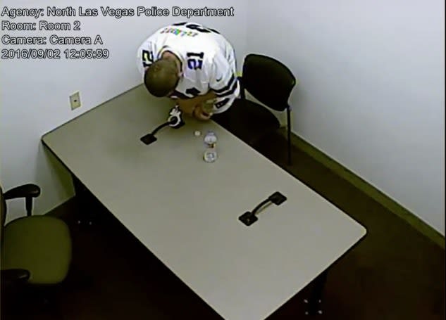 Minutes before he snaps the hinges off his handcuffs, the murder suspect looks around the North Las Vegas police interrogation room, his eyes focused on the ceiling through which he would later escape.