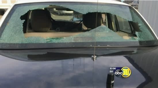Madera police said the officer attempted to make a traffic stop early Sunday when the suspect driving a Mazda SUV sped off around 4:30 a.m. As the suspect weaved through the neighborhood, a passenger in the Mazda reached out the window and shot at the police cruiser, shattering a window and narrowly missing the officer and a civilian passenger, police said.