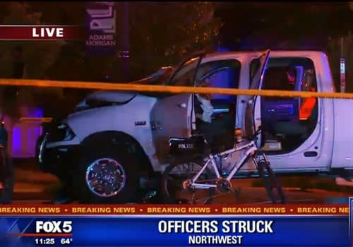 After striking the officers, the truck proceeded through the intersection and ended up hitting a large unoccupied dump truck parked on the roadway just past Columbia Road in Adams Morgan.
