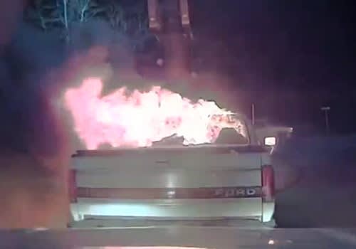 Around 9 p.m. Saturday, February 11, Officer Chris Womack was able to successfully push a Ford truck engulfed in flames away from the structure using his patrol vehicle, and no injuries were reported.