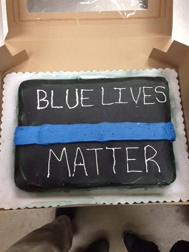 Starnes shared a photo of the cake, which showed a thick and lumpy blue line of frosting surrounded by the words “Blue Lives Matter” in white, off-center text, Macon.com reports.