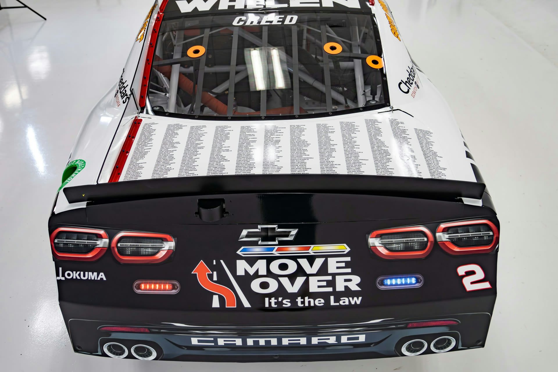 “We’re proud to support NLEOMF and to honor those who lost their lives in the line of duty,” Creed said before Monday’s race. “Carrying the names of the fallen on the decklid of the No. 2 Whelen Chevrolet is a special tribute, and our team will make them proud at Charlotte Motor Speedway,” he added. Creed also wore a special NLEOMF-themed fire suit for the race. This is the second year in a row that Whelen Engineering partnered with NLEOMF and RCR to honor fallen officers with a dedicated paint scheme.