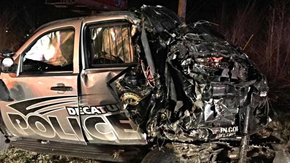 A police officer in Decatur, TX, is lucky to be alive after an 18-wheeler reportedly slammed into his parked patrol SUV.