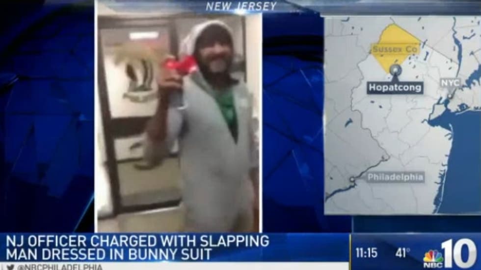 A New Jersey police officer accused of slapping a man who was wearing a bunny costume and was blowing an air horn inside a police station has been charged with assault.