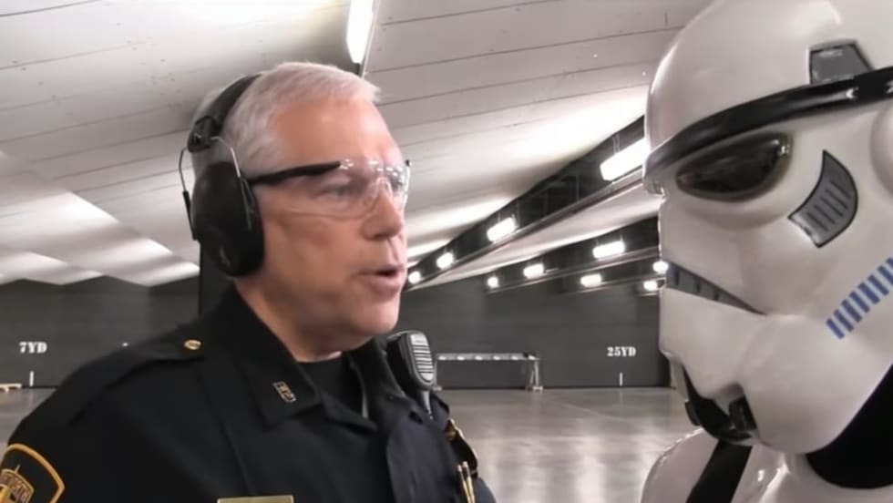In the video posted Friday morning, a Fort Worth PD firearms instructor tries to teach a storm trooper from the "Star Wars" movies how to shoot. The storm troopers are notoriously bad shots.