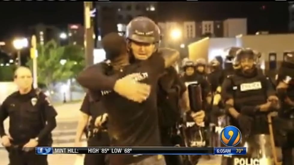 A man who travels to cities rocked by anti-police protests after officer-involved shootings and hugs police officers was on the streets of Charlotte Wednesday night as protesting transitioned to rioting.