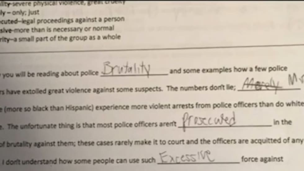 The lesson words listed on the sheet were: brutality, merely, prosecuted, excessive and minority. Students were instructed to fill in the blanks.