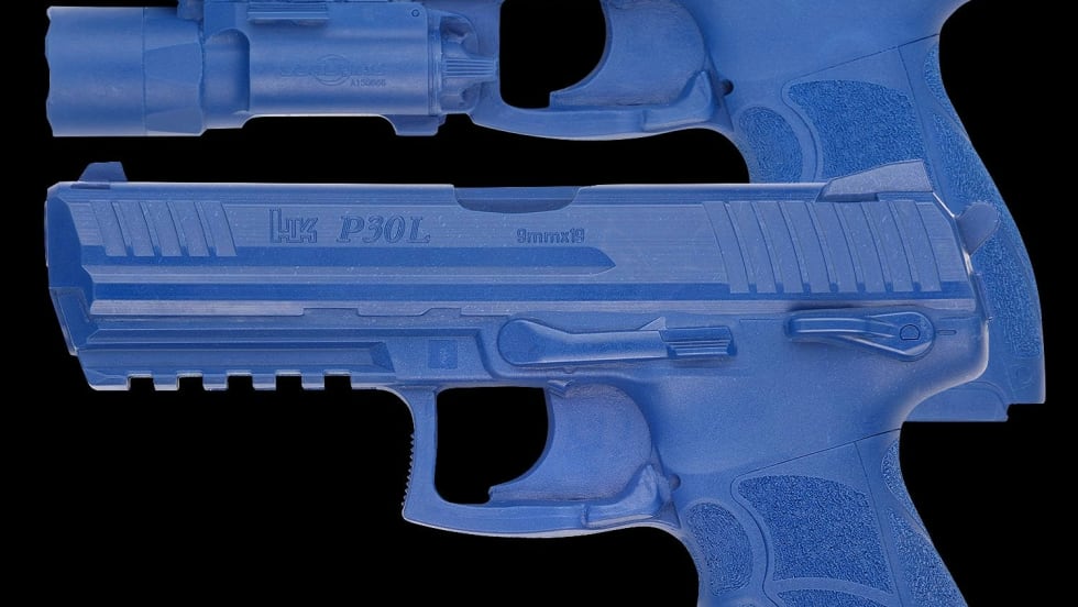 The H&K P30L with and without the Surefire X300 Tactical Light training pistol replica is now available from Ring's Manufacturing. The H&K P30L Bluegun training pistol is molded from solid blue polyurethane to differentiate it from a live weapon.