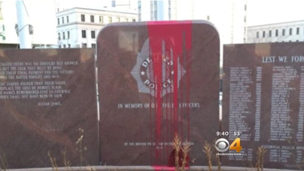 Denver's memorial to fallen Denver Police officers was vandalized with red paint sometime Sunday night or early Monday morning almost a year since the same kind of act last year.